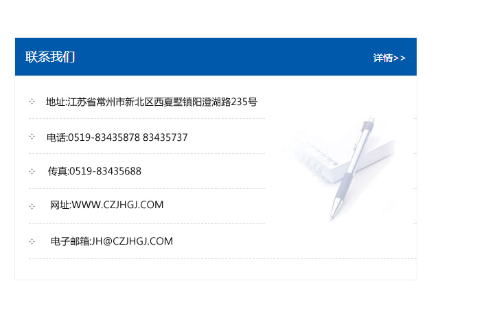 傳真:0519-83435688    郵編:213135    網址:WWW.czjhgj_com.yujiajidian.com    電子郵箱:JH@czjhgj_com.yujiajidian.com